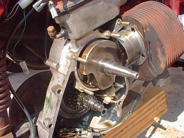 They think it's all over...well it is now...a famous English saying...yesterday Bec and the kids were riding around on this...today (24th July 1999) it's in bits...well it was in the morning...it is now back together and running...the output shaft bearing went on strike...no damage done...just the bearing and the seal...I would have had this done yesterday evening but all the spares shops were shut when we noticed it...I stripped it down to this in 30 minutes last night...